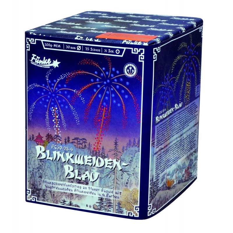 25 Schuss Batterie im Kaliber 30mm mit Blinkschweifaufstieg zu blauer Päonie mit Blinkweiden in 4 verschiedenen Farben, im Wechsel geschossen mit abschließender Finalsalve. Effekte: - Weissblinker-Schweifaufstieg zu weißer Blinkweide mit blauen Sternen - Rotblinker-Schweifaufstieg zu Roter Blinkweide mit blauen Sternen - Grünblinker-Schweifaufstieg zu Grüner Blinkweide mit blauen Sternen - Goldblinker-Schweifaufstieg zu Goldener Blinkweide mit blauen Sternen.